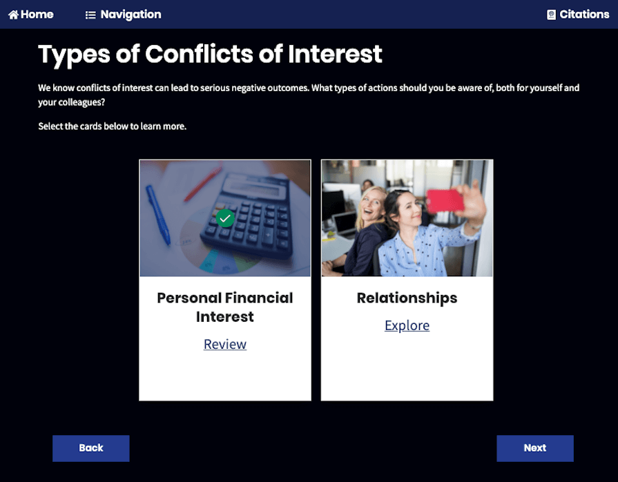 Our conflict of interest training course provides peace of mind for your organization and employees when conducting everyday business—especially when facing an ethical dilemma such as gift-giving and receiving. Our team of compliance experts has created this employee-focused, interactive conflict of interest training that includes conflict of interest training scenarios to teach employees how to recognize and avoid conflicts of interest in the workplace, whether they are personal, financial, or family-related interests.