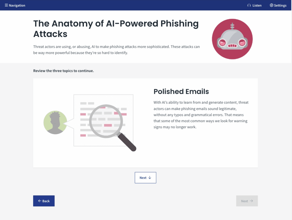 We’ve recently updated our course content with the latest data and cybersecurity best practices to ensure globally applicable legal alignment. New scenarios and video content will help cement the material and engage your employees in a critical topic area for organizations. An additional module on Artificial Intelligence will cover how to keep your company data safe and protected against attacks using AI.