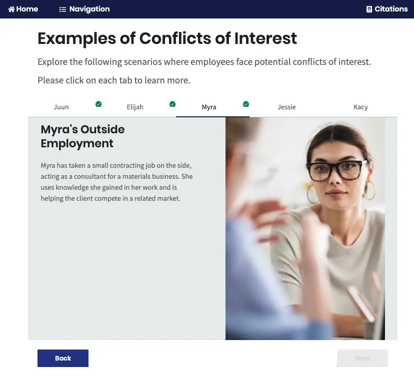 Employees apply lessons from code of conduct training through branching quizzes that measure their response to real-world workplace ethics and professional conduct challenges.